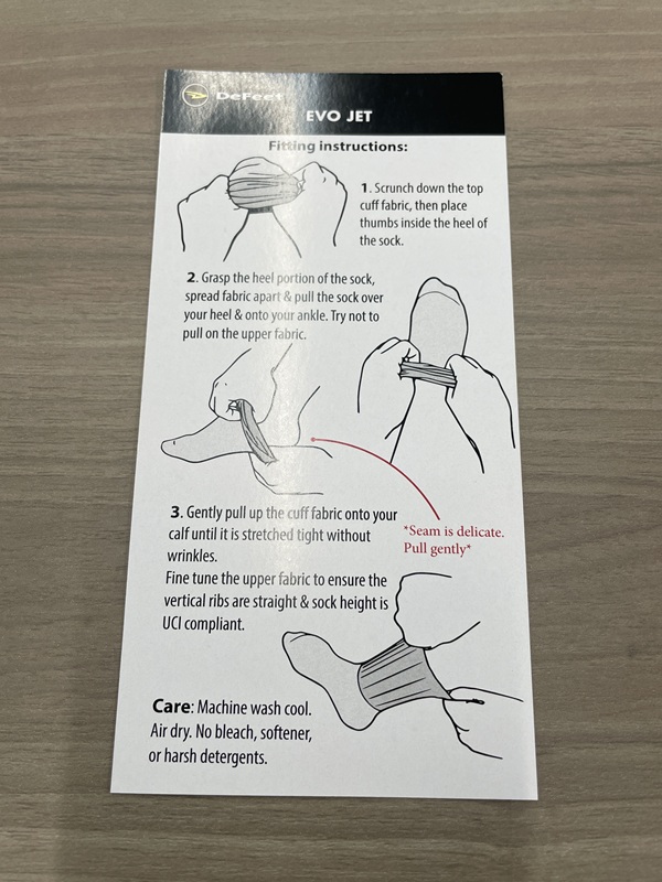 「風洞試験をクリアした"EVO JET"は究極のスプリントソックスです。通常時速60km/hで走行する場合、素足と比較して25ワット以上、標準的なソックスと比較して27ワット以上、一般的なエアロソックスと比較して13ワット以上の出力を削減します。」(直訳)