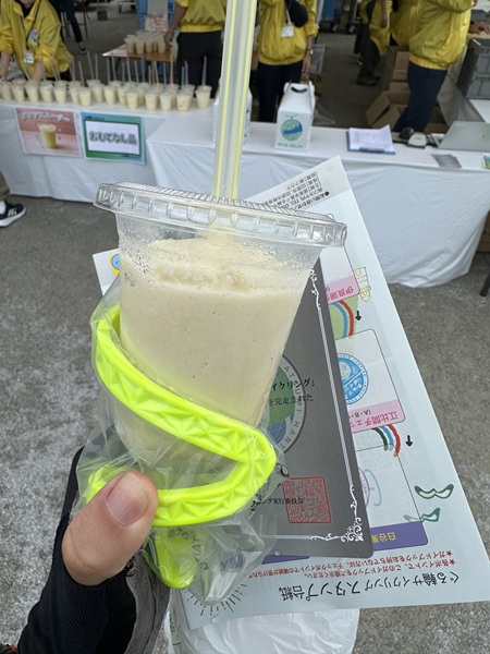 ゴール地点では完走者に対して空くじなしのくじとメロンスムージーが振舞われていました。メロンスムージーめちゃくちゃおいしい!!くじはボトルケージでした(嬉しいw