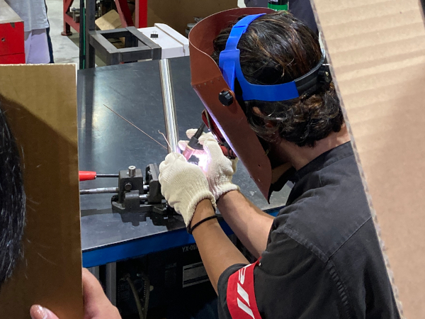 溶接時の強い光を直接見てしまうと目がやられてしまうので、黒いフィルム越しに見学しました。
