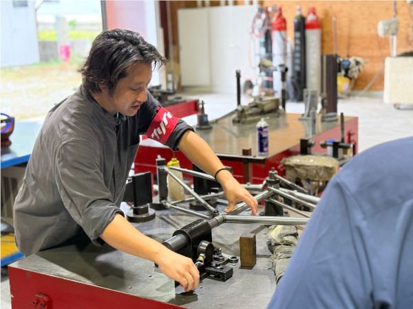 必要な強度を生むための溶接方法を接合箇所で変え、歪みの戻りまで計算に入れて手作業で、何度も専用の治具に嵌めて溶接後の精度をチェックしていきます。