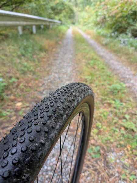 以前使用していた時も感じていたのですが、グラベルへ向かう道中のオンロードツーリングでの転がりが非常に軽いのが印象的です。不整地でのグリップを重視したタイヤの場合、どうしても舗装路での走行感が抵抗で重くなりロードノイズも発生してしまうのですが、このタイヤは転がりが非常に軽く、ノイズも気になりません。それでいて適度なエアボリュームと全面に配した背の低いノブにより、不整地では路面をしっかりと捉えます。