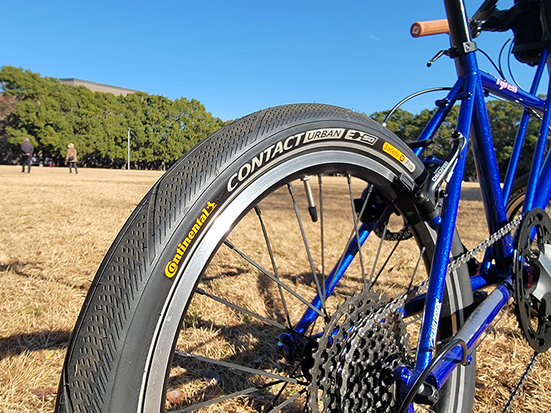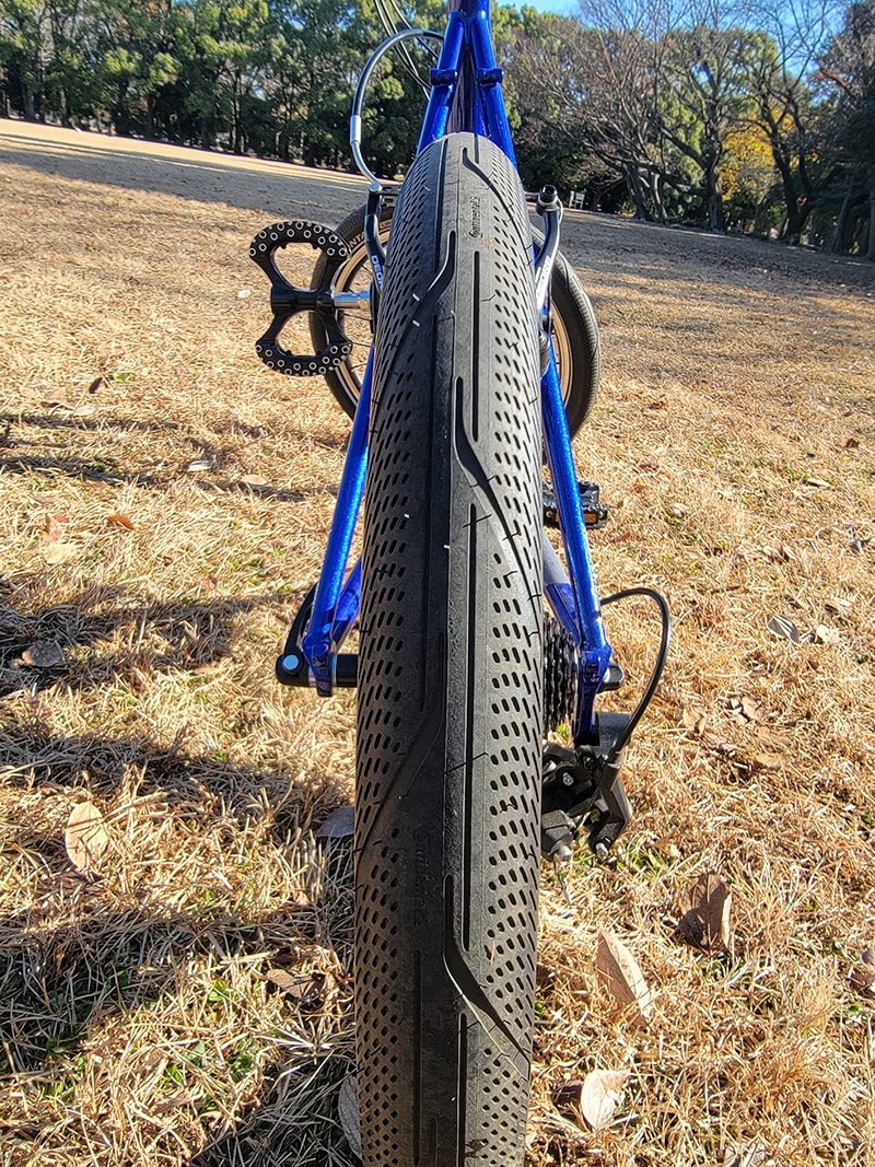 LooX は V ブレーキ仕様なので、太めのタイヤを履けるのが魅力。今回は、コンチネンタルの定番タイヤ「コンタクトアーバン」に新しく追加された 20×2.00(20インチ・幅50mm)をインストールしました。