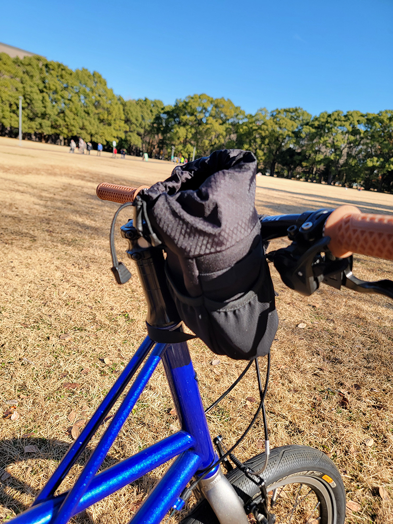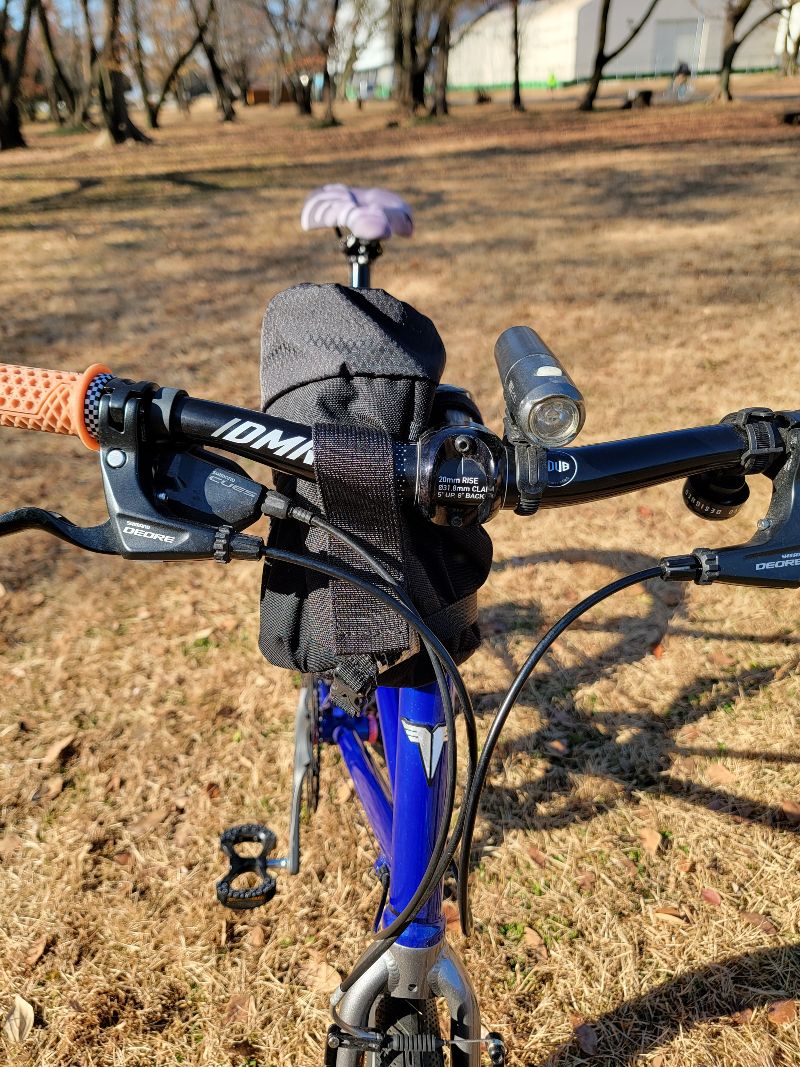 スマホや小銭入れ、鍵などを入れられる便利なステムバッグです。暑い時期にはペットボトルもすんなり入るので、一度付けると手放せない便利アイテムです!