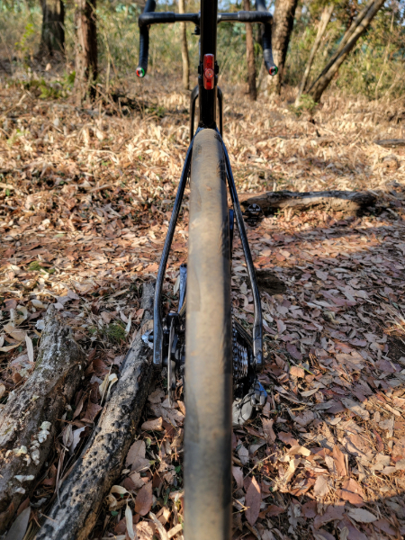 ロードライドの寄り道でグラベルに突入。未舗装路への食いつきは無いものの、シクロクロスタイヤより太いので十分に走行可能。