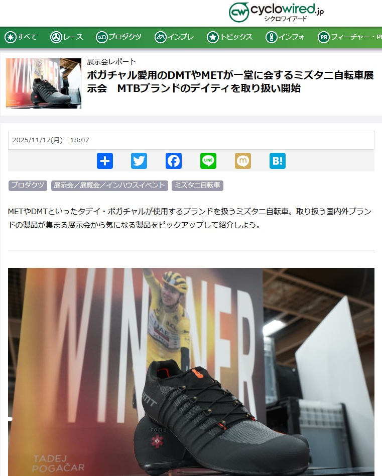 cyclowired.jpで弊社展示会の模様が掲載されました!ポガチャル愛用のDMTやMETが一堂に会するミズタニ自転車展示会 MTBブランドのデイティを取り扱い開始 - 展示会レポート | cyclowired