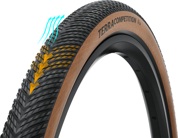 Terra Competition は、ラフな舗装路、締まった土路面、軽いグラベルといったドライ〜モイストな条件で性能を最大化するよう最適化された専用トレッドパターンを採用。