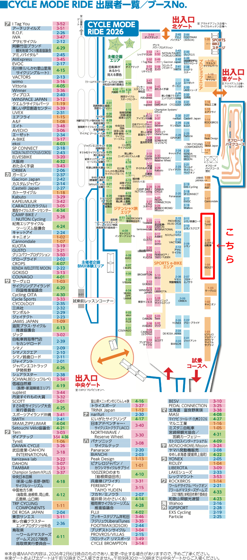 出展ブースは例年通り、出入り口中央ゲートを入って右側通路を進んでいただけましたら、ベルギーブランドの"RIDLEY"と香川県の小径車ブランド"Tyrell"も同様にございます。