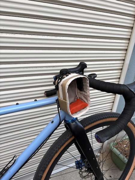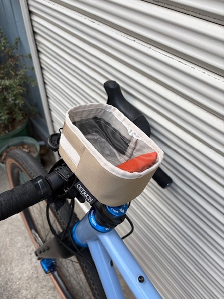 付属のストラップでハンドルやステム、フロントバッグなどにも装着することが可能。内側にポケットがついているのでアクスタを収納もできます。座布団付き。