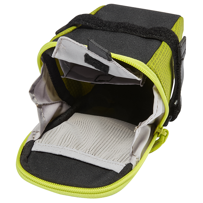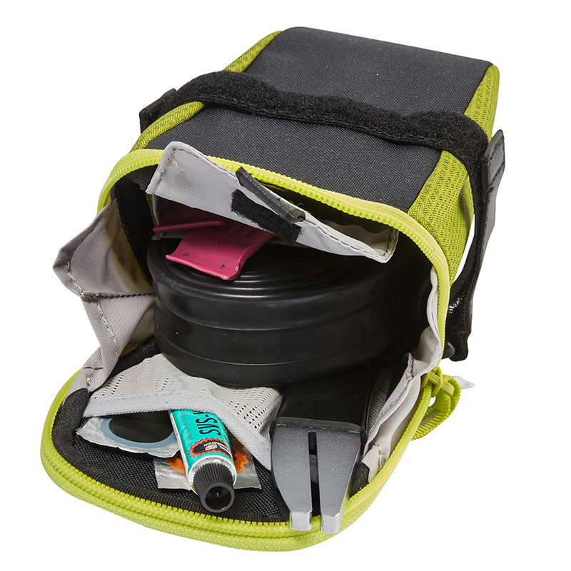 ベルクロで取り付けるためどんなサドルの下にもフィットし、0.9Lの容量はエマージェンシーキットに加え、薄手のレインジャケットも入れることができます。さらに、セーフティライト用のストラップも付いています。