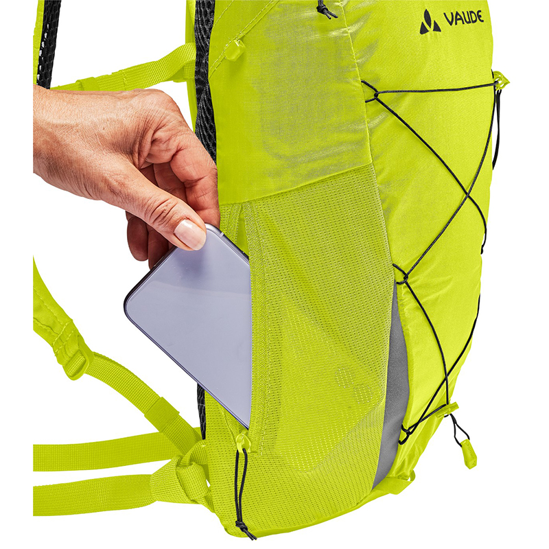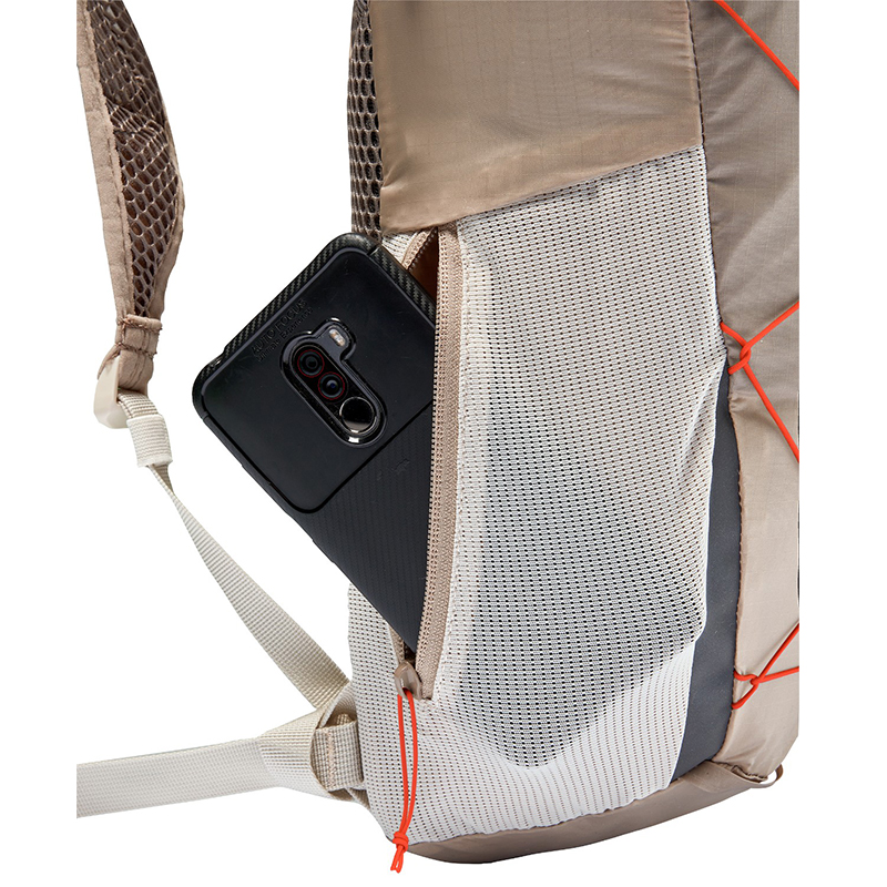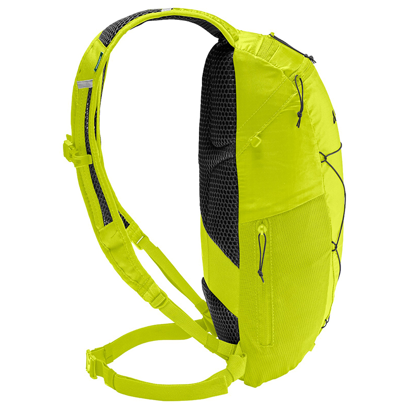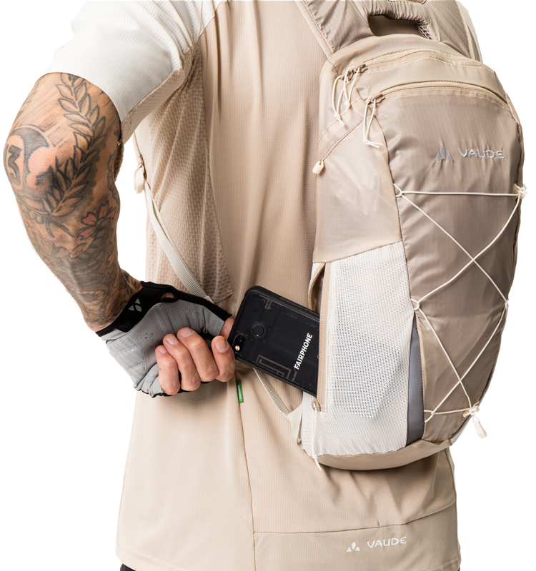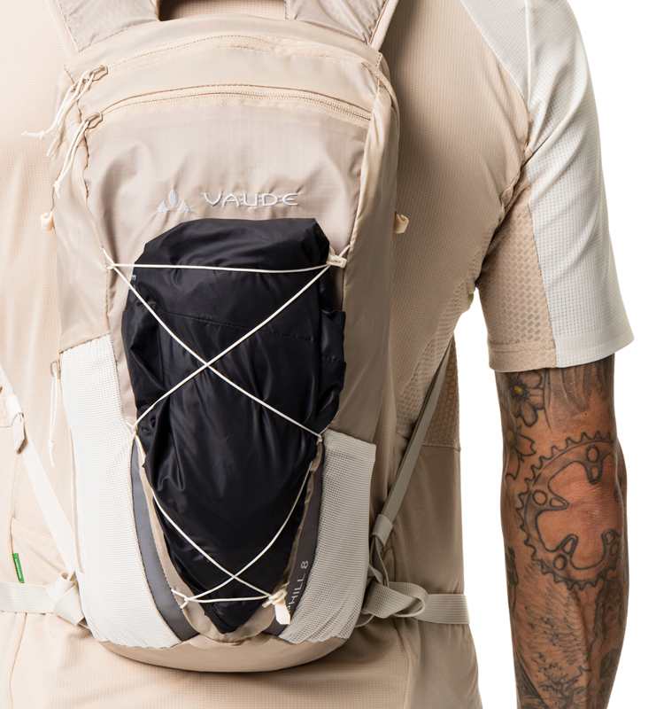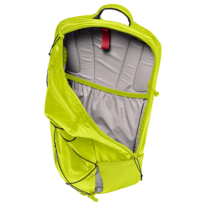 左右非対称の開口部を持つメインコンパートメントは8リットルの容量を持ち、フラットで伸縮性のあるメッシュポケットとジップサイドポケットにより、パックを脱ぐことなくスマホや補給食にアクセスできます。