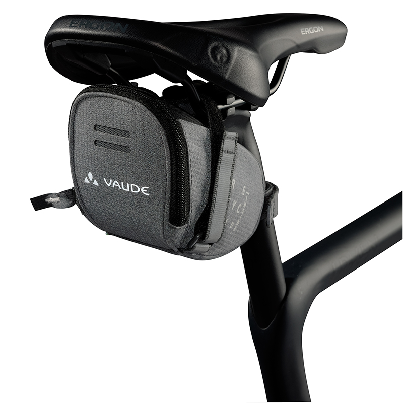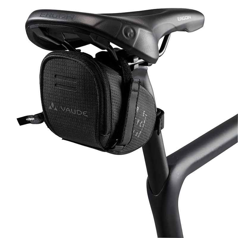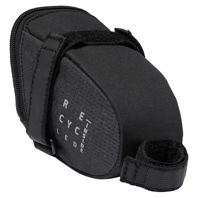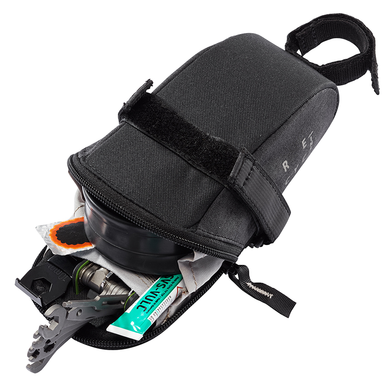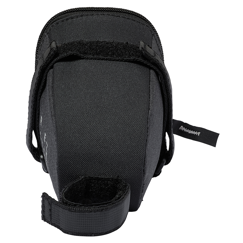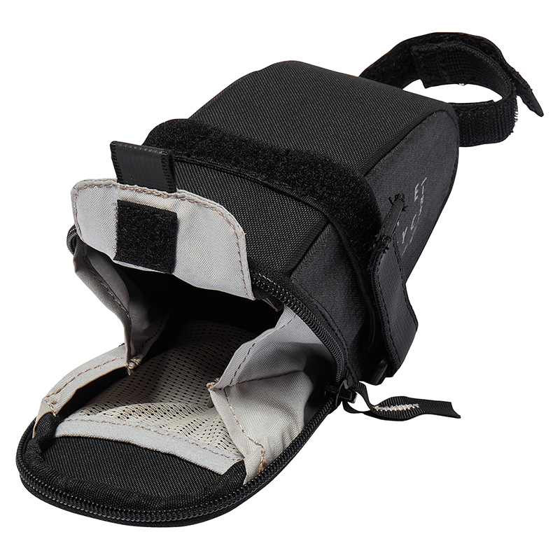 ベルクロで取り付けるためどんなサドルの下にもフィットし、0.55Lの容量はスペアチューブとタイヤレバー、エマージェンシーキットなどを入れることができます。さらに、セーフティライト用のストラップも付いています。