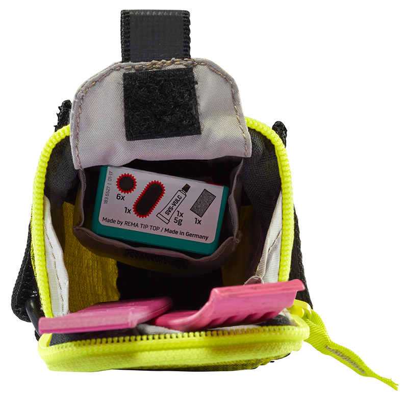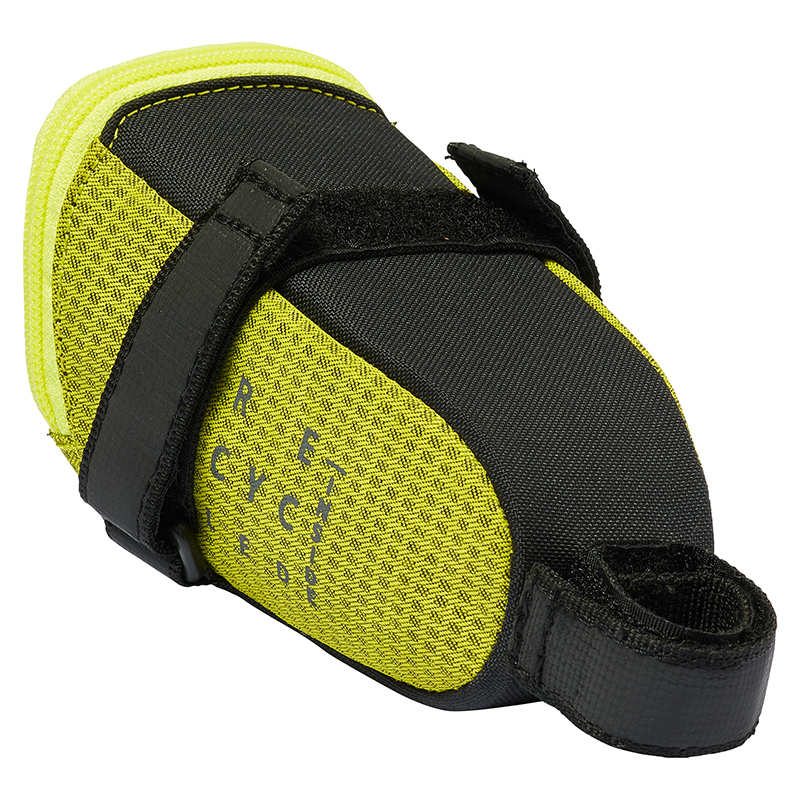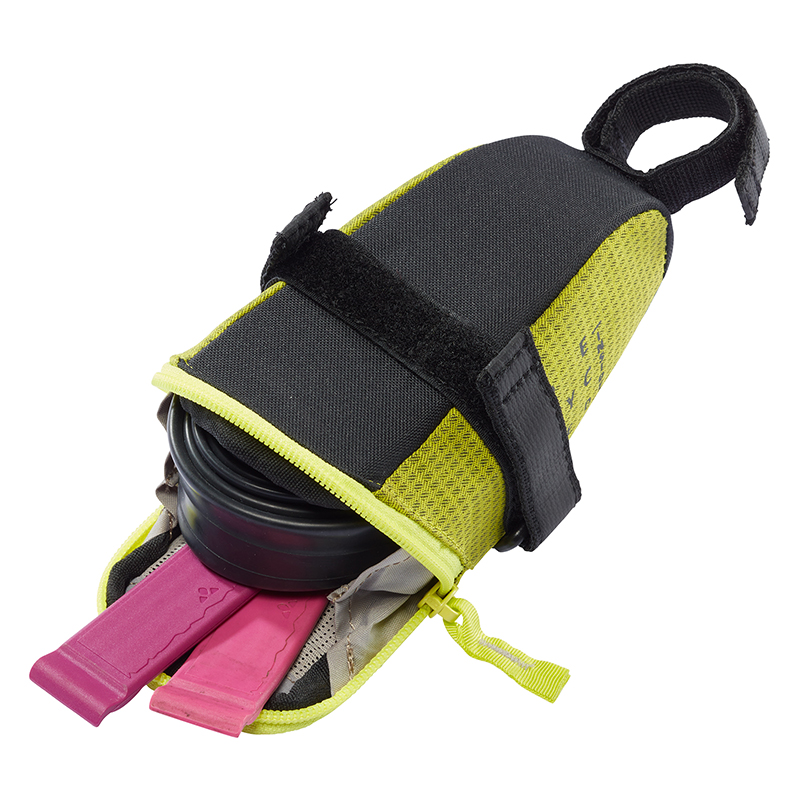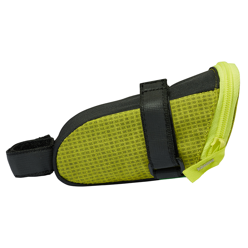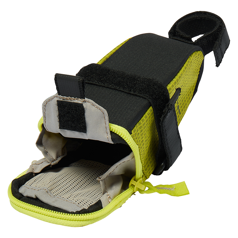 ベルクロで取り付けるためどんなサドルの下にもフィットし、0.35Lの容量はスペアチューブとタイヤレバー、エマージェンシーキットなどを入れることができます。さらに、セーフティライト用のストラップも付いています。