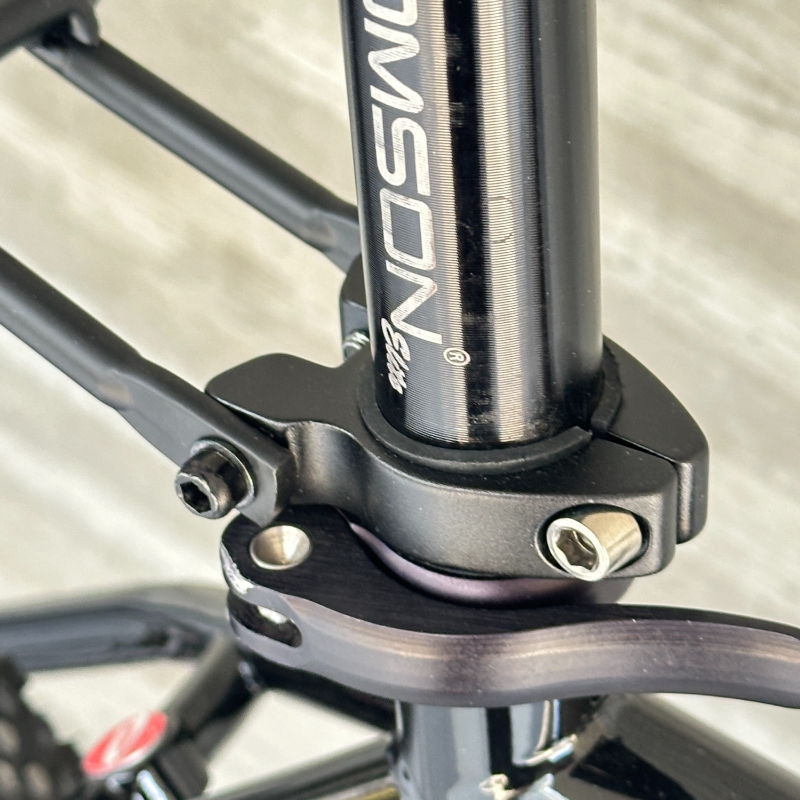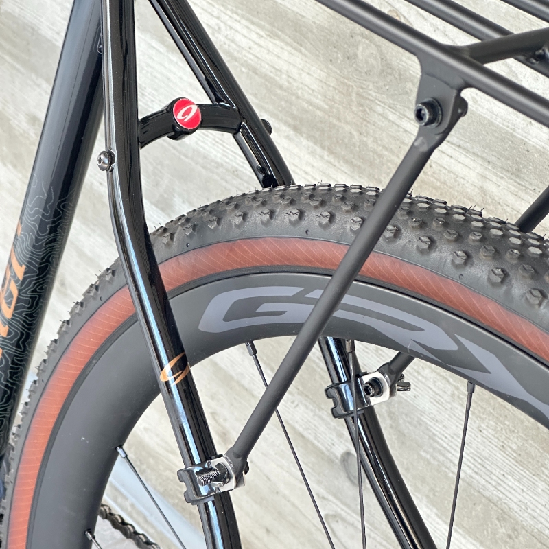 サドルに取り付けたバッグが走行中タイヤに接触しないようにするためのアルミ製バッグサポートです。