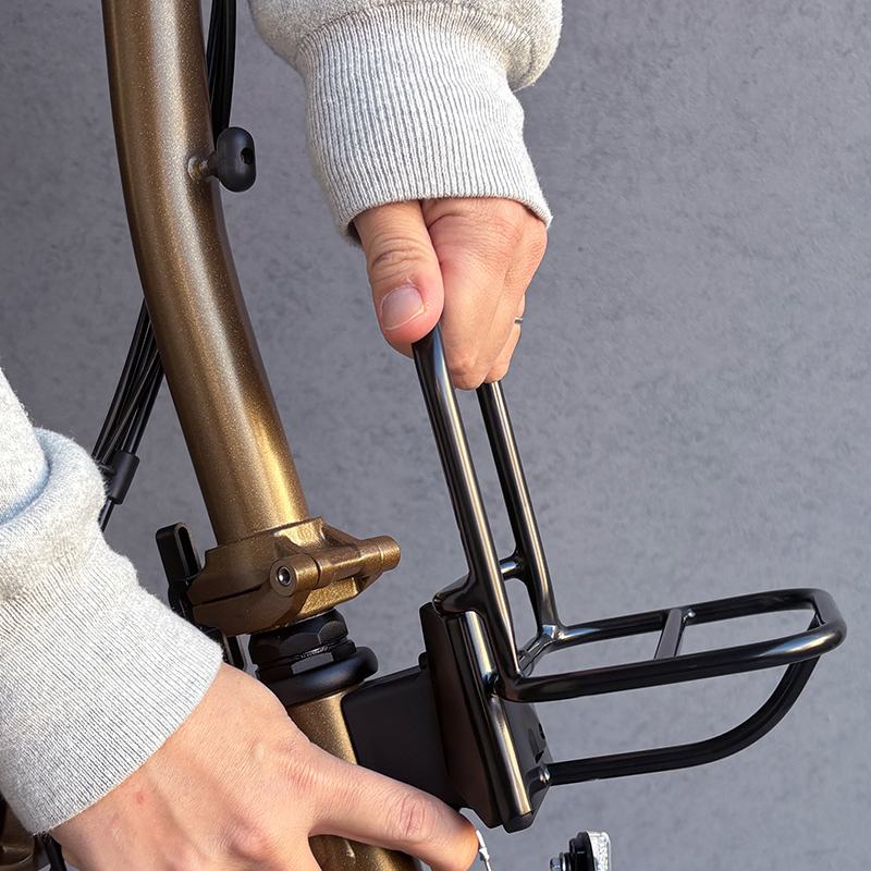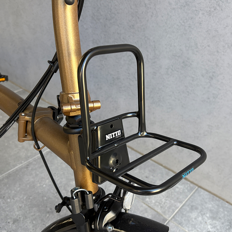 BROMPTON(ブロンプトン)に付いている樹脂製のバッグアダプターに取り付けることができる小さめのフロントキャリアです。