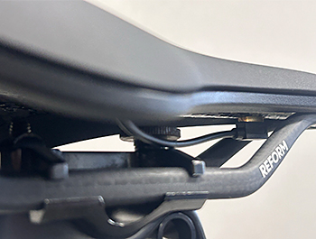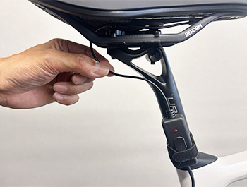- サドル裏側前方にあるACコネクターにAC プラグ(マグネット固定)をサドル後方から接続し、ACケーブルが突っ張らない様にテープなどでスイッチ本体をシートポストに固定します。接続時にコネクターに汚れがないかを確認し、汚れがある場合には取り除いてから接続します。